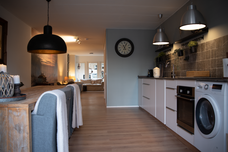 Through the entrance you enter a spacious living area with a fully equipped kitchen and a large dining table for up to 8 people. On the patio side, there is a cozy living room with a TV corner.
